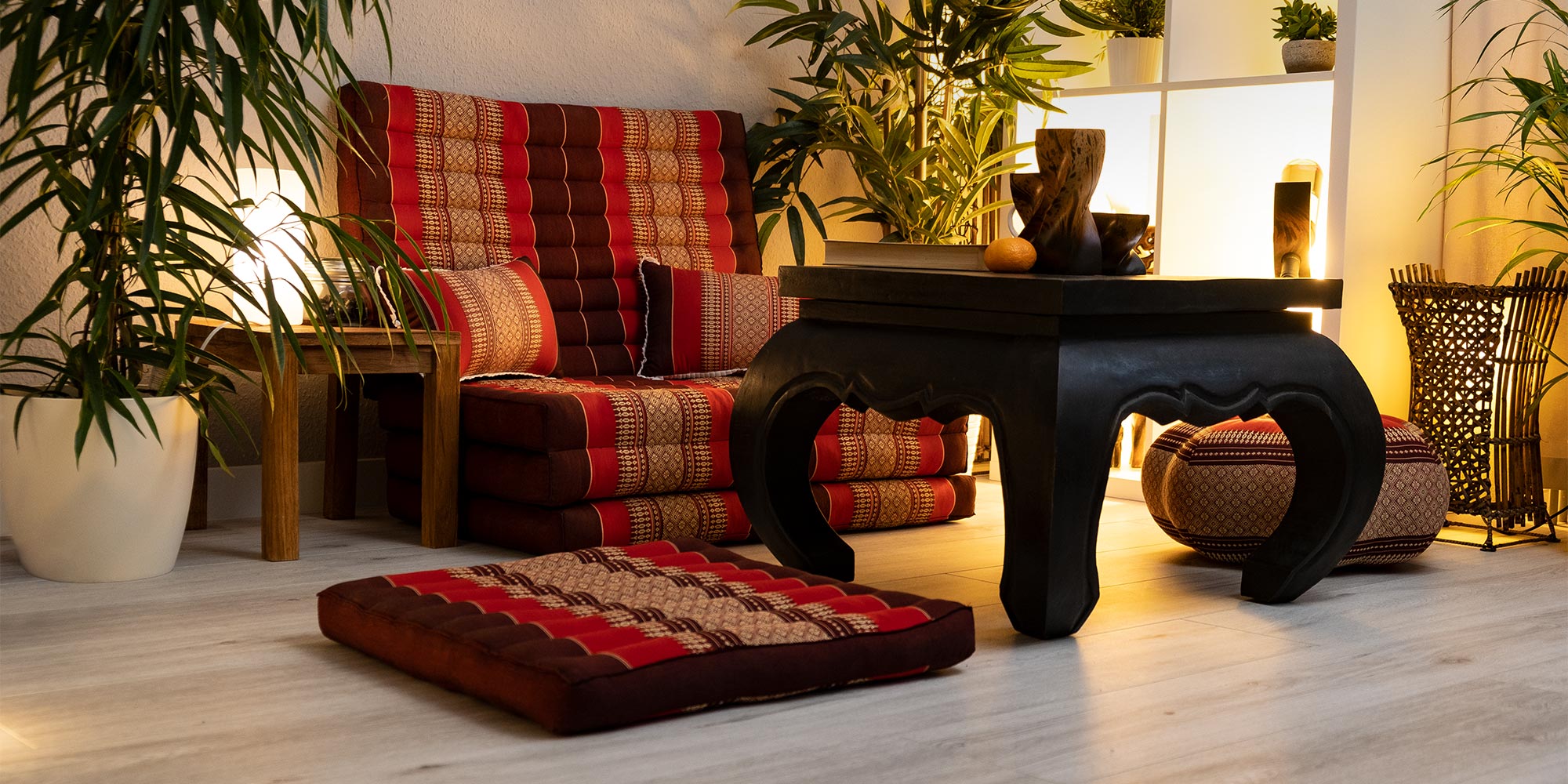 Puoi scegliere tra uno, due o tre elementi pieghevoli ggiuntivi. Nelle versioni XXL, i cuscini thai sono perfetti anche per più persone. Sui cuscini tailandesi, sui materassi pieghevoli e sui tappetini arrotolabili dell’Estremo Oriente puoi rilassarti meravigliosamente: i tuoi pensieri possono scorrere ed il benessere aumenta. I nostri cuscini per sedili, tappetini arrotolabili e materassi pieghevoli con imbottitura in kapok sono anche molto apprezzati come supporti per lo yoga e la meditazione. Sono ideali per gli esercizi spirituali che mettono in armonia corpo e mente.